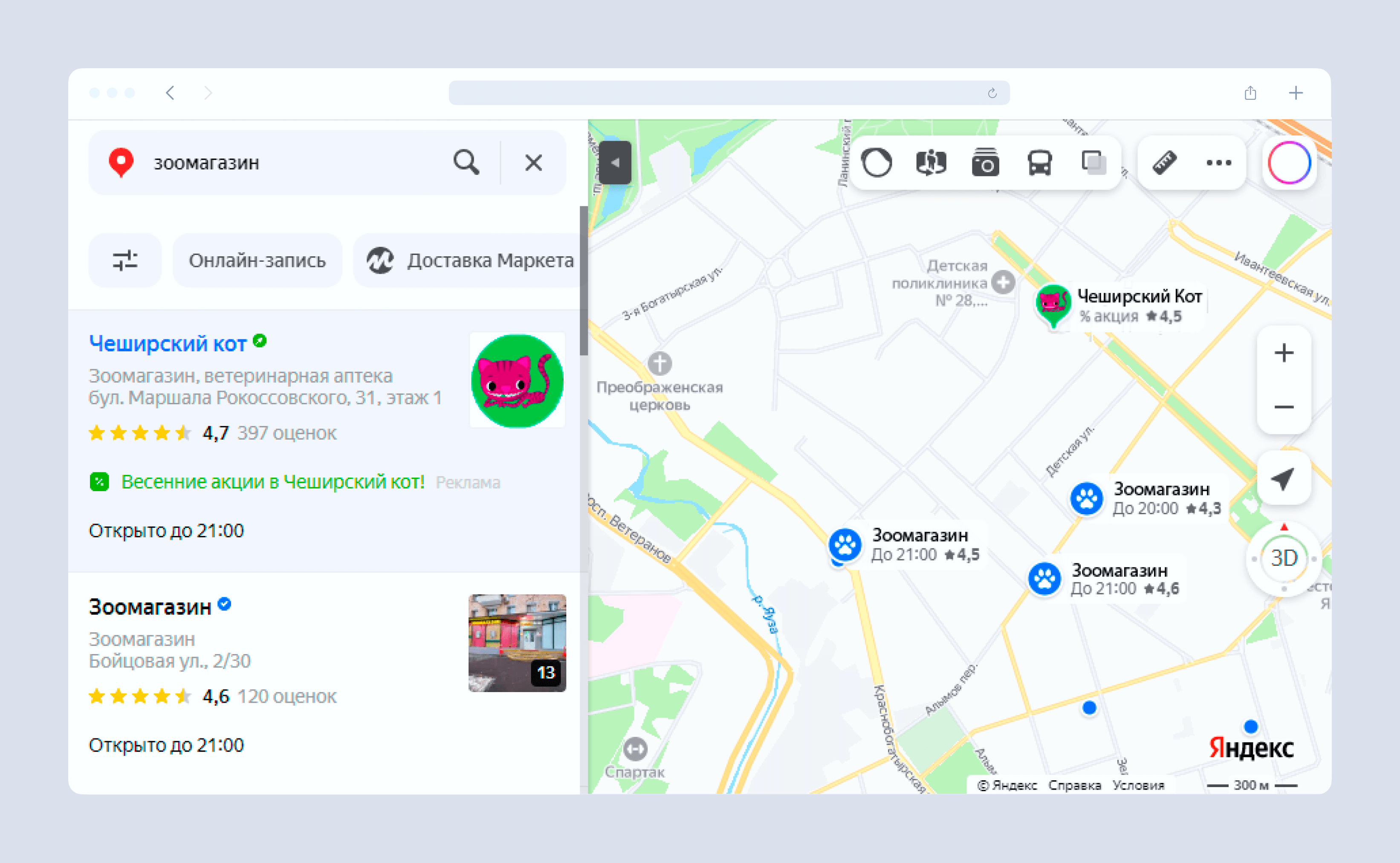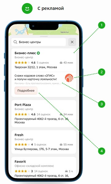 Пользователи видят такую рекламу в результатах поиска по рубрикам и организациям. Она учитывает их интерес к определённым товарам и услугам в конкретном месте: